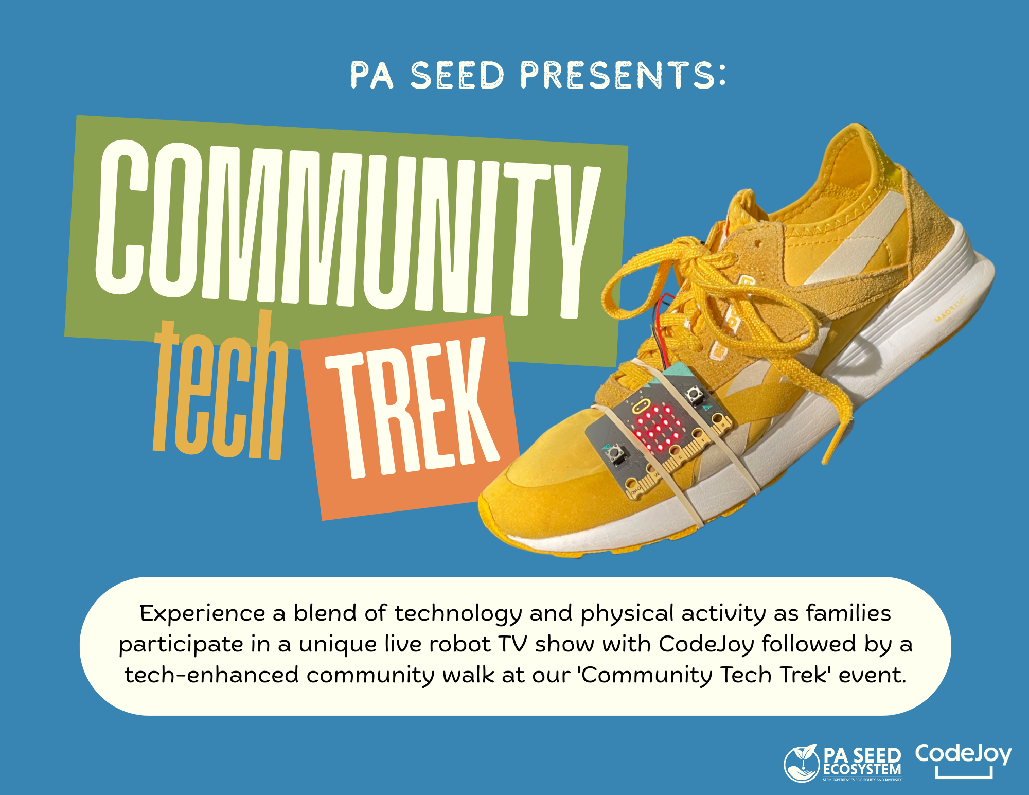 Experience a blend of technology and physical activity as families participate in a unique live robot TV show with CodeJoy, followed by a tech-enhanced community walk at our 'Community Tech Trek' event.